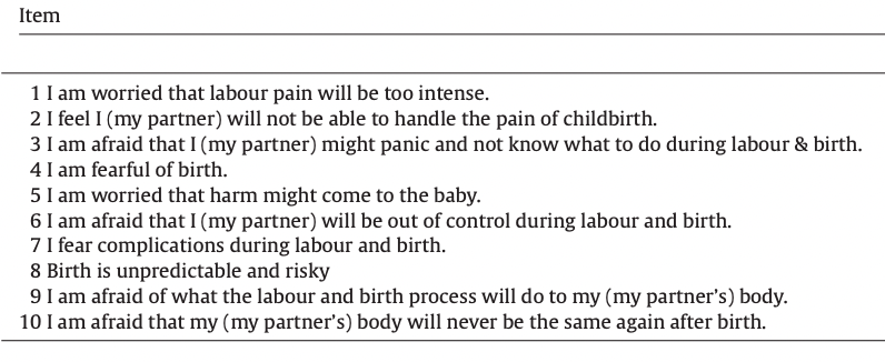 - Stoll, K., Hauck, Y., Downe, S., Edmonds, J., Gross, M. M., Malott, A., McNiven, P., Swift, E., Thomson, G., & Hall, W. (2016). Cross cultural development and psychometric evaluation of a measure to assess fear of childbirth prior to pregnancy. Sexual & Reproductive Healthcare, 8, 49–54. https://doi.org/10.1016/j.srhc.2016.02.004 (Article that introduced the 10 item CFPP)
